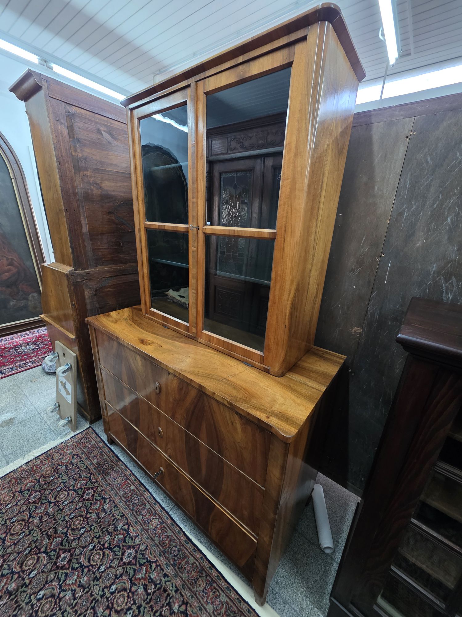 Aufsatzkommode mit Vitrinenoberteil. Biedermeier in seiner Reinform. Schlichte Formensprache mit sehr schönem Furnierbild. Zeitlich um 1840. Aufsatz ist abnehmbar.