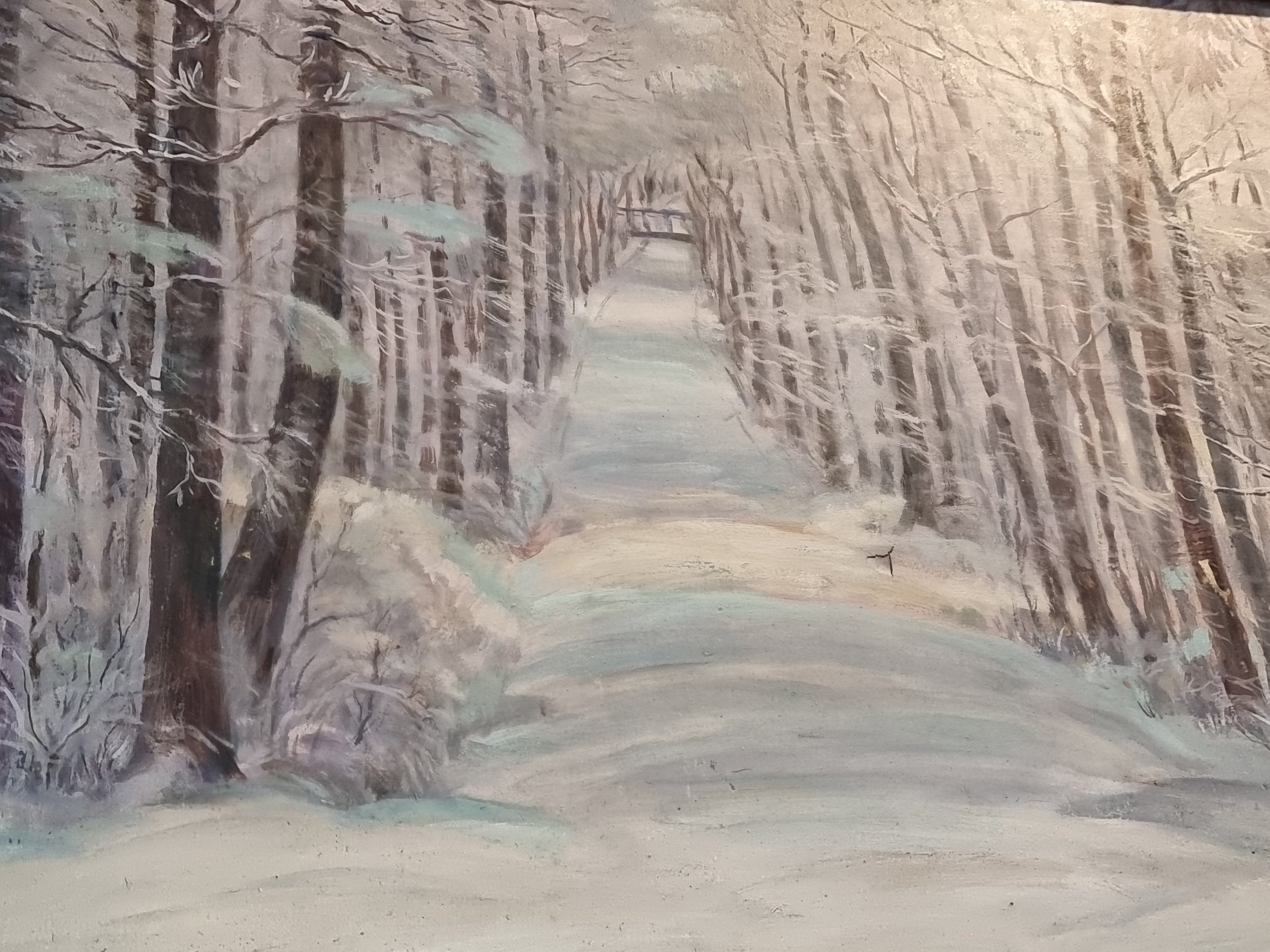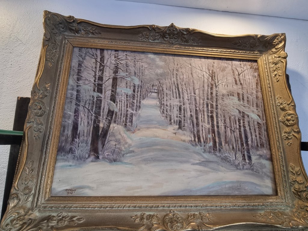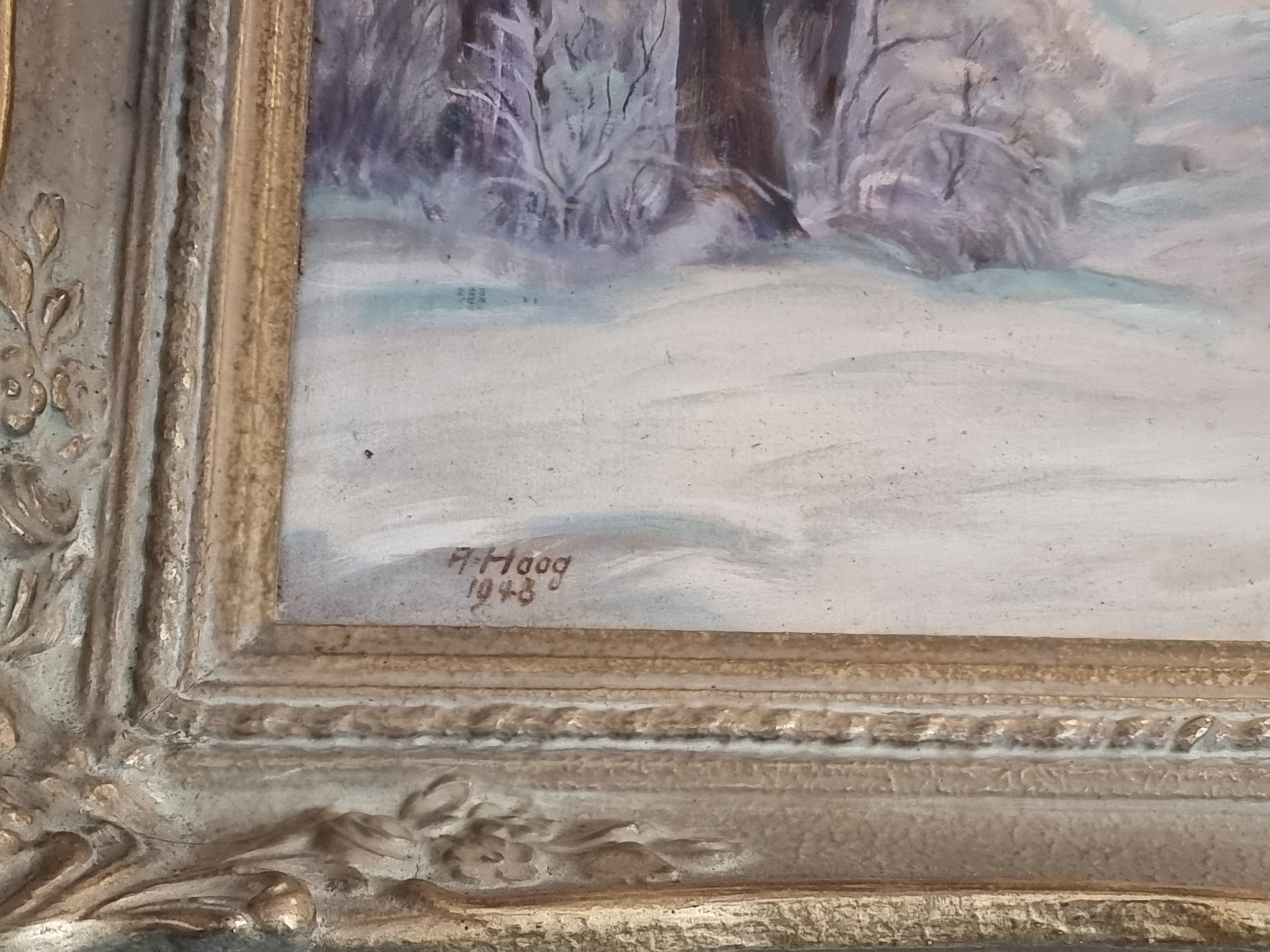 Eine winterliche Waldlandschaft. Signiert mit A. oder R. Haag 1948. Ein zugefrorener Fluss verläuft durch einen Wald. Im Zentrum des Bildes eine kleine Brücke. Wunderbare Ausführung der Bäume und eine besondere Textur des Schnees. Öl auf Leinwand. Guter Erhaltungszustand mit einem kleinen Riss in der Leinwand. Rahmen gut erhalten.