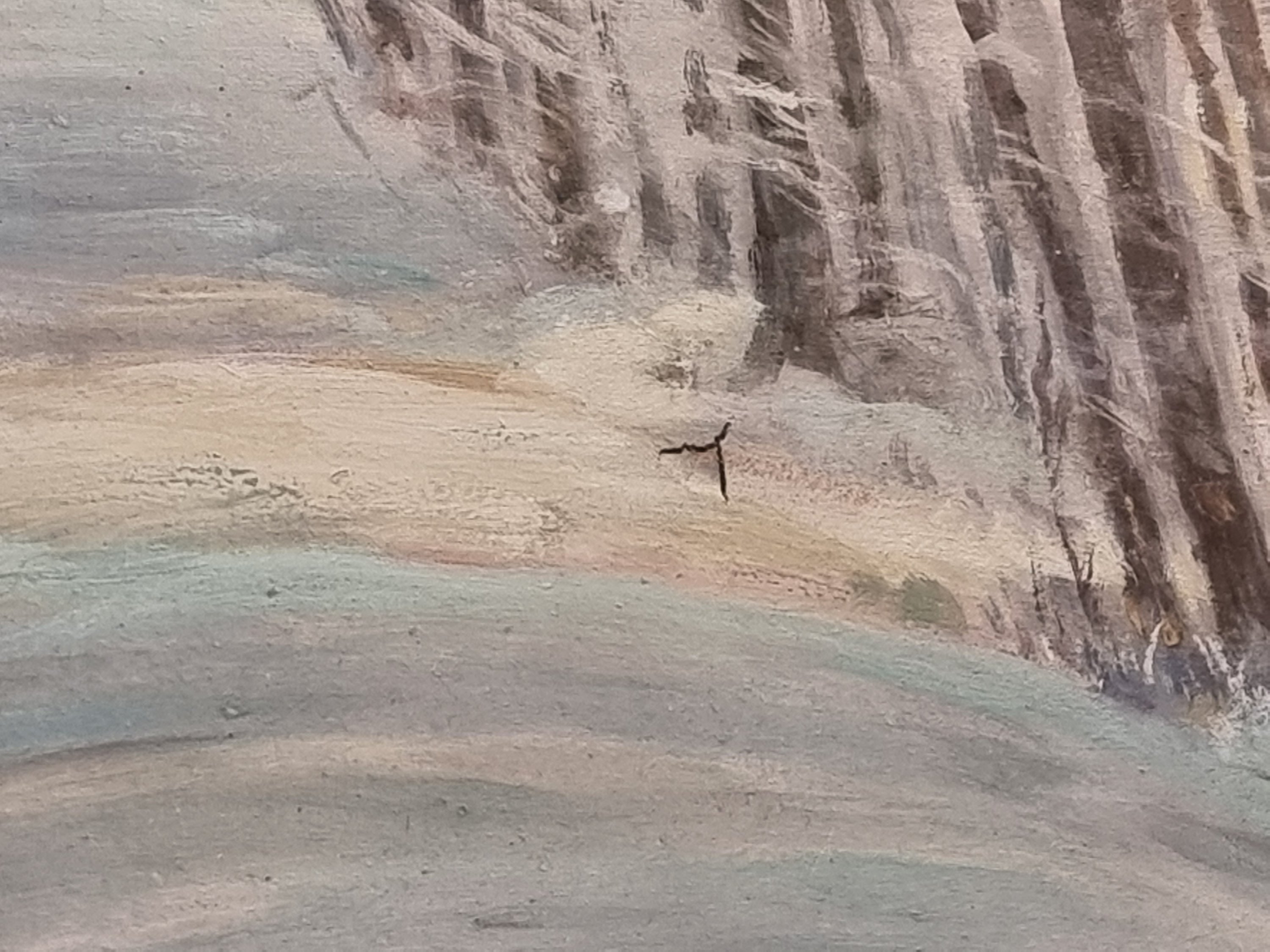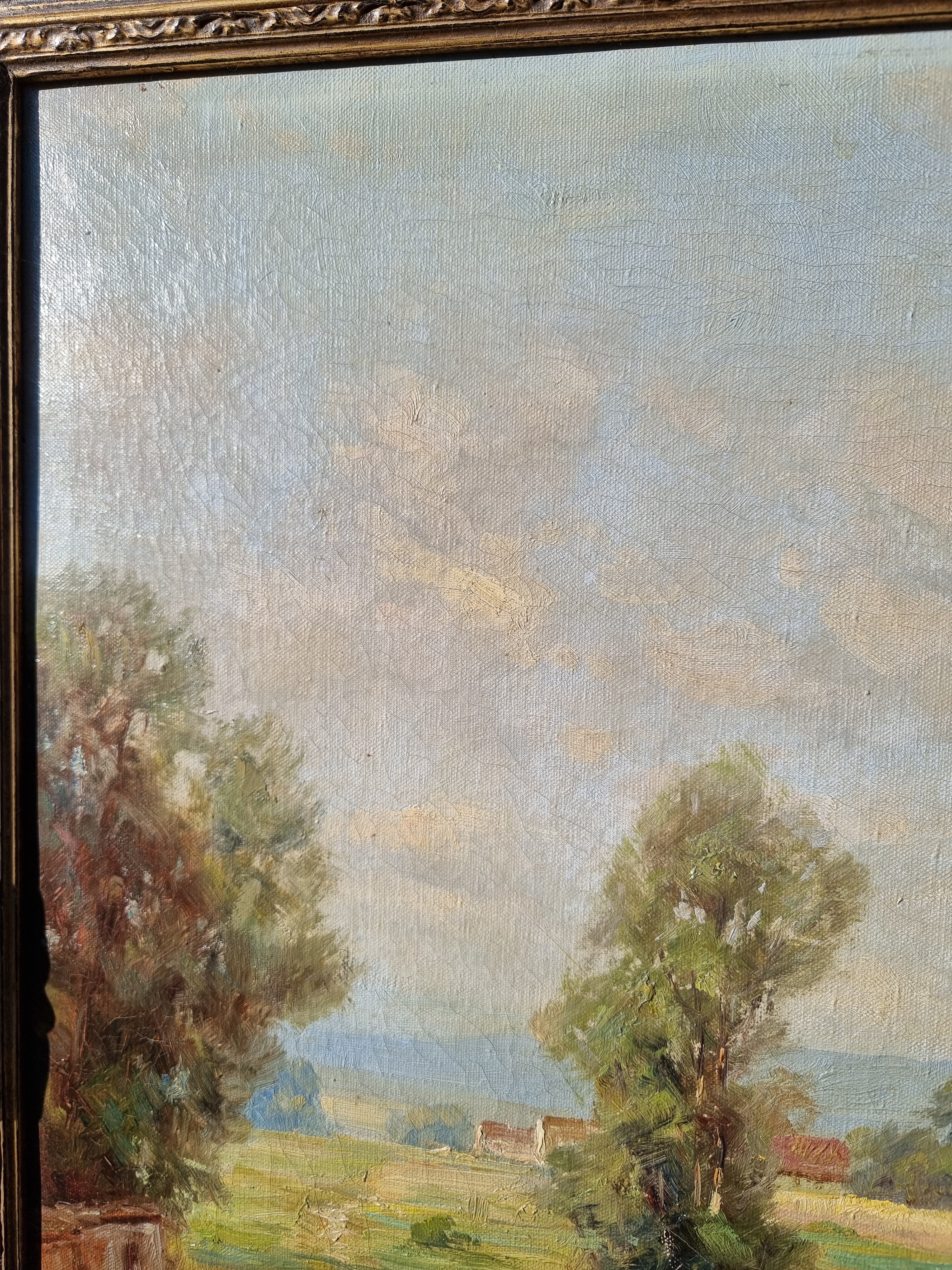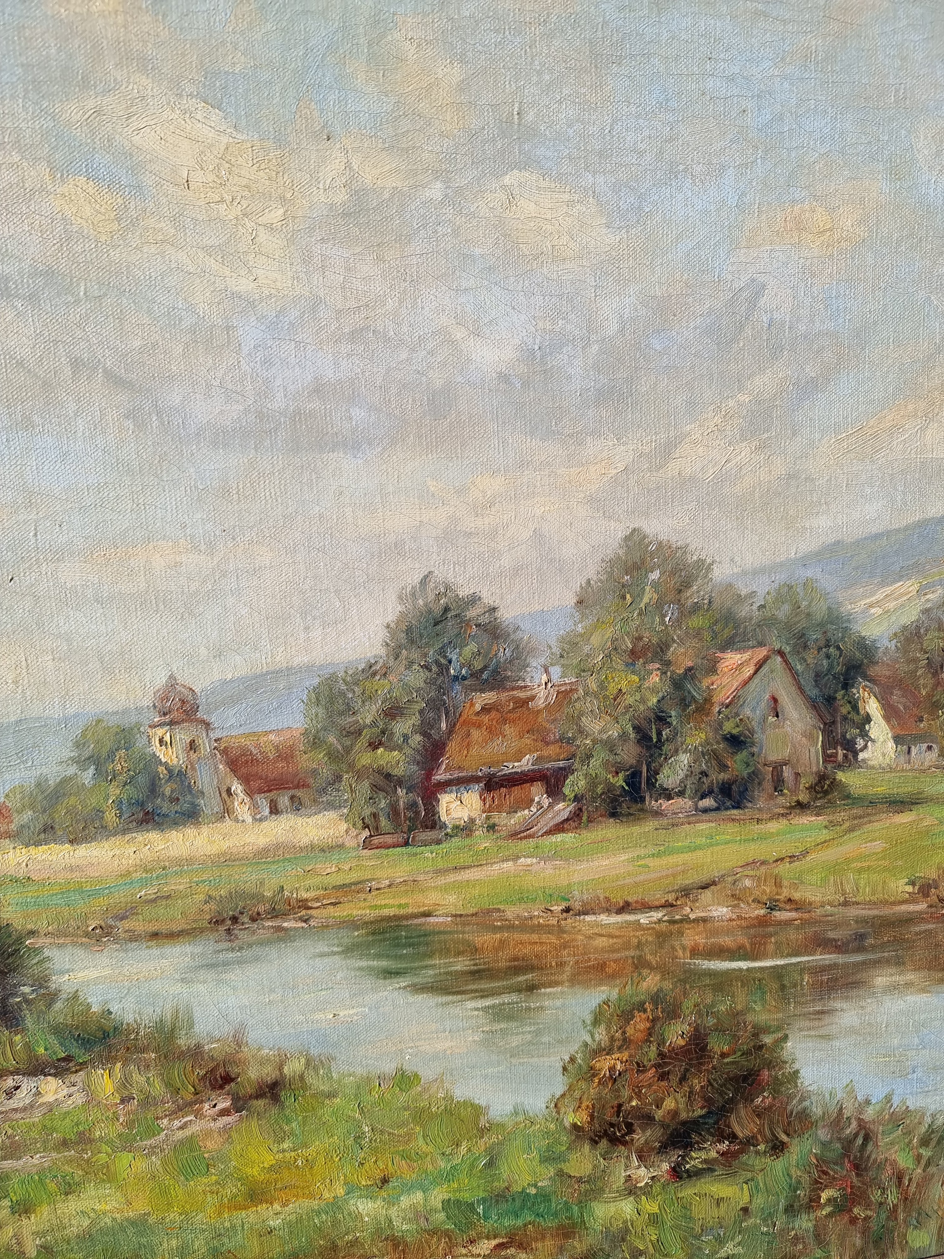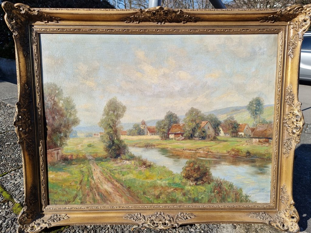 Wunderbare helle Farben zeichnen dieses Gemälde aus. Ein Fluss zieht sich quer durch Bild. Parallel dazu verläuft ein Weg, auf dem der Betrachter zu laufen scheint. In der rechten Bildmitte ist eine kleine Ortschaft dargestellt. Prominent ragt hier eine kleine Kirche mit Zwiebelturm hervor. Öl auf Leinwand. Sehr schöner Erhaltungszustand. Vermutlich 1920er Jahre. Unten links signiert.