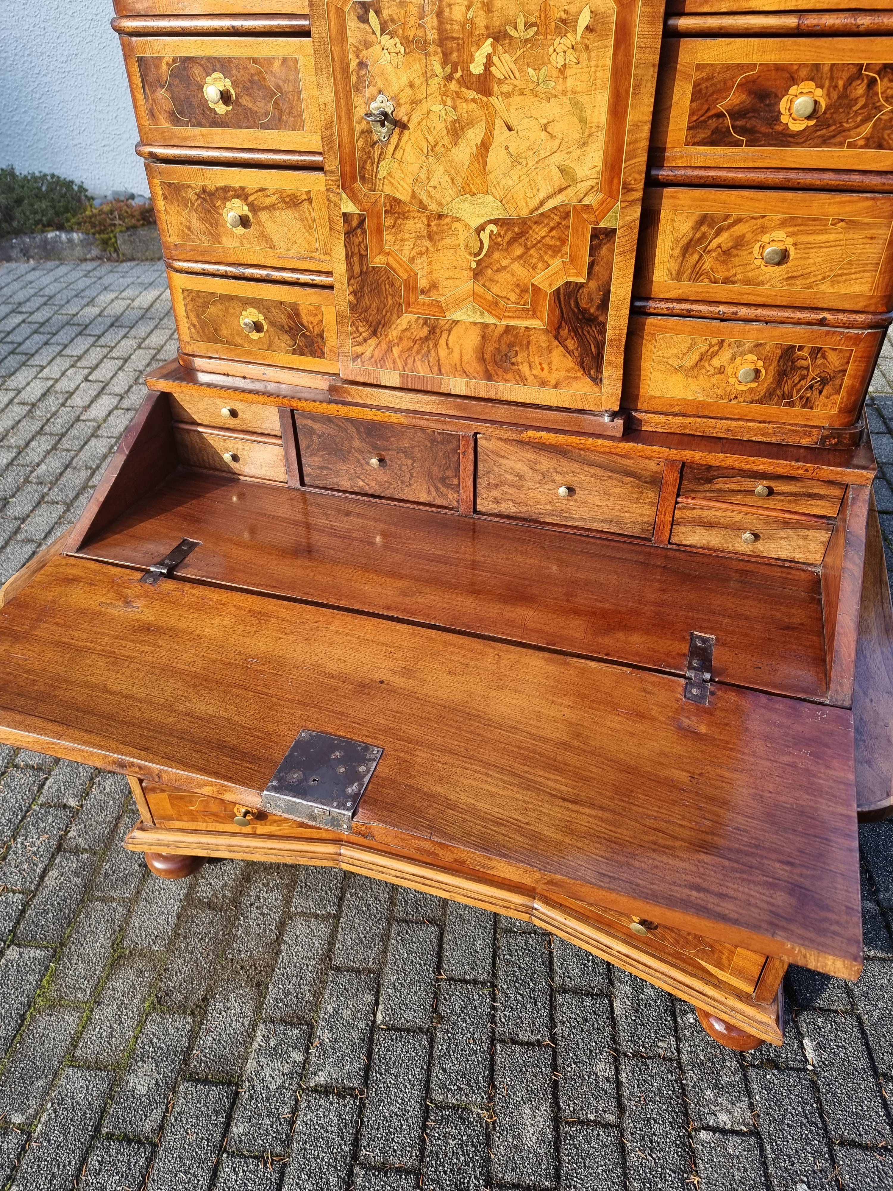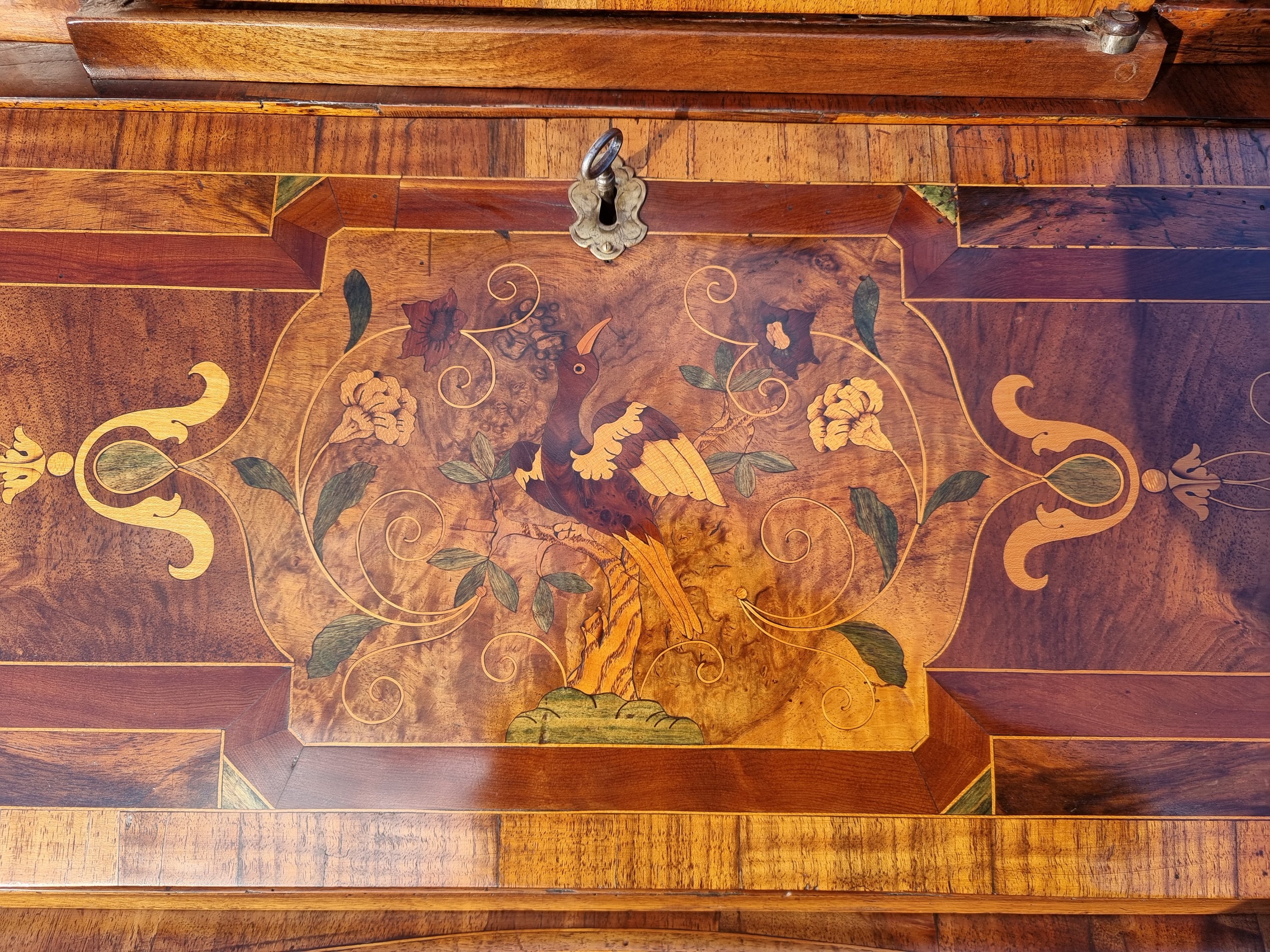 Der Schreibteil ist leicht zurückgesetzt mit einer abgeschrägten Schreibplatte. Sehr aufwenige Intarsien auf der Außenfront der Schreibplatte. Geometrisch eingelegte Nussbaumbänder. Im Inneren Voluten und andere Ornamentik. Diese flankieren den außergewöhnlich schönen Mittelteil der Schreibplatte. Dort sitzt ein Paradiesvogel auf einem Baum. Besonders schön sind die grün gebrannten Einlegearbieten. Diese Ornamentik findet sich auch auf der Tabernakeltür des Aufsatzes wieder.