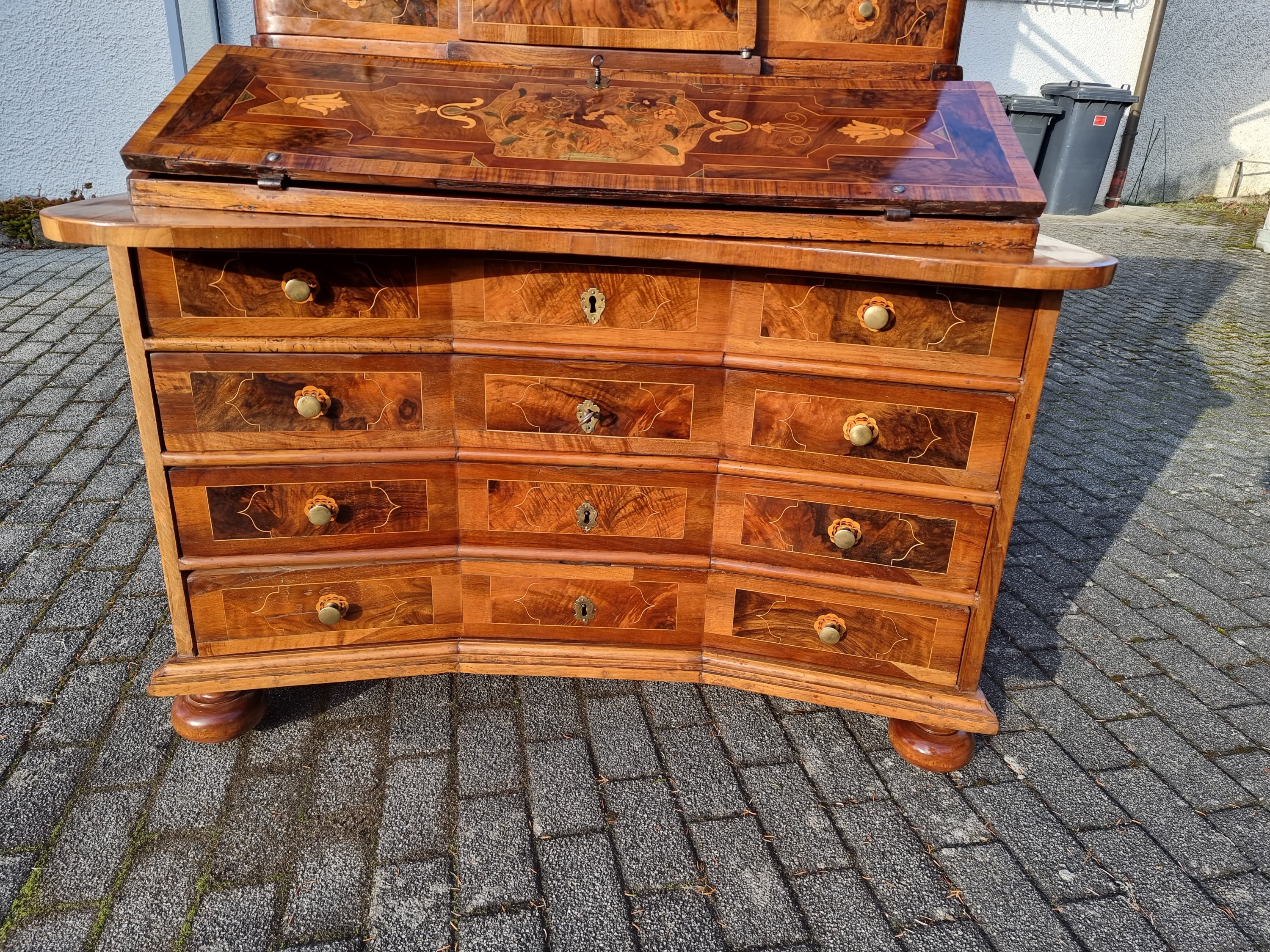 Originaler Kirchheimer Tabernakelsekretär aus der Zeit um 1740/50. Sogenannter a‘ trois corps. D.h. der Sekretär ist aus drei Teilen aufgebaut. Der kommodenförmige Unterbau, der Schreibklappenteil und der Aufsatz mit der Tabernakeltür.